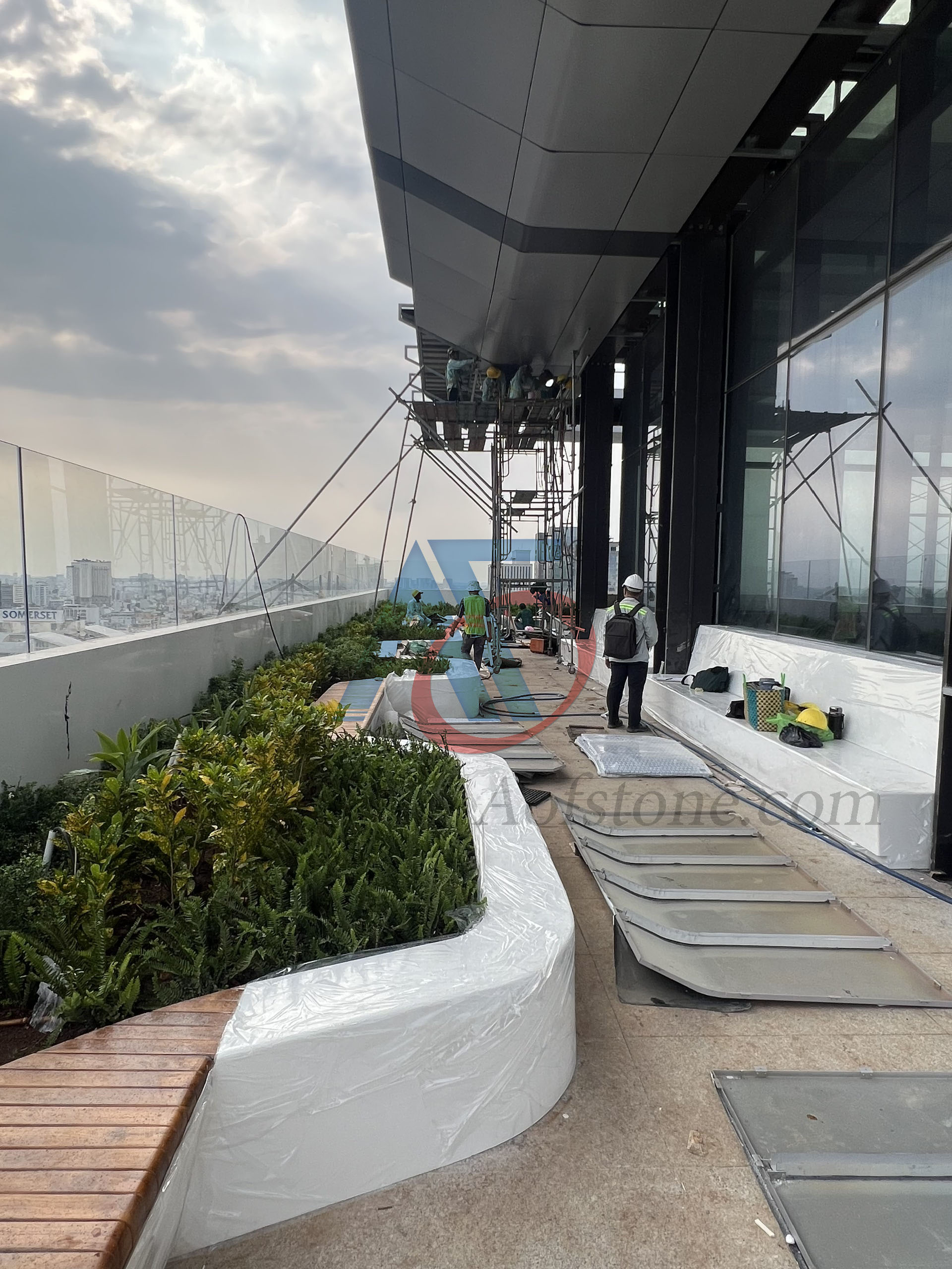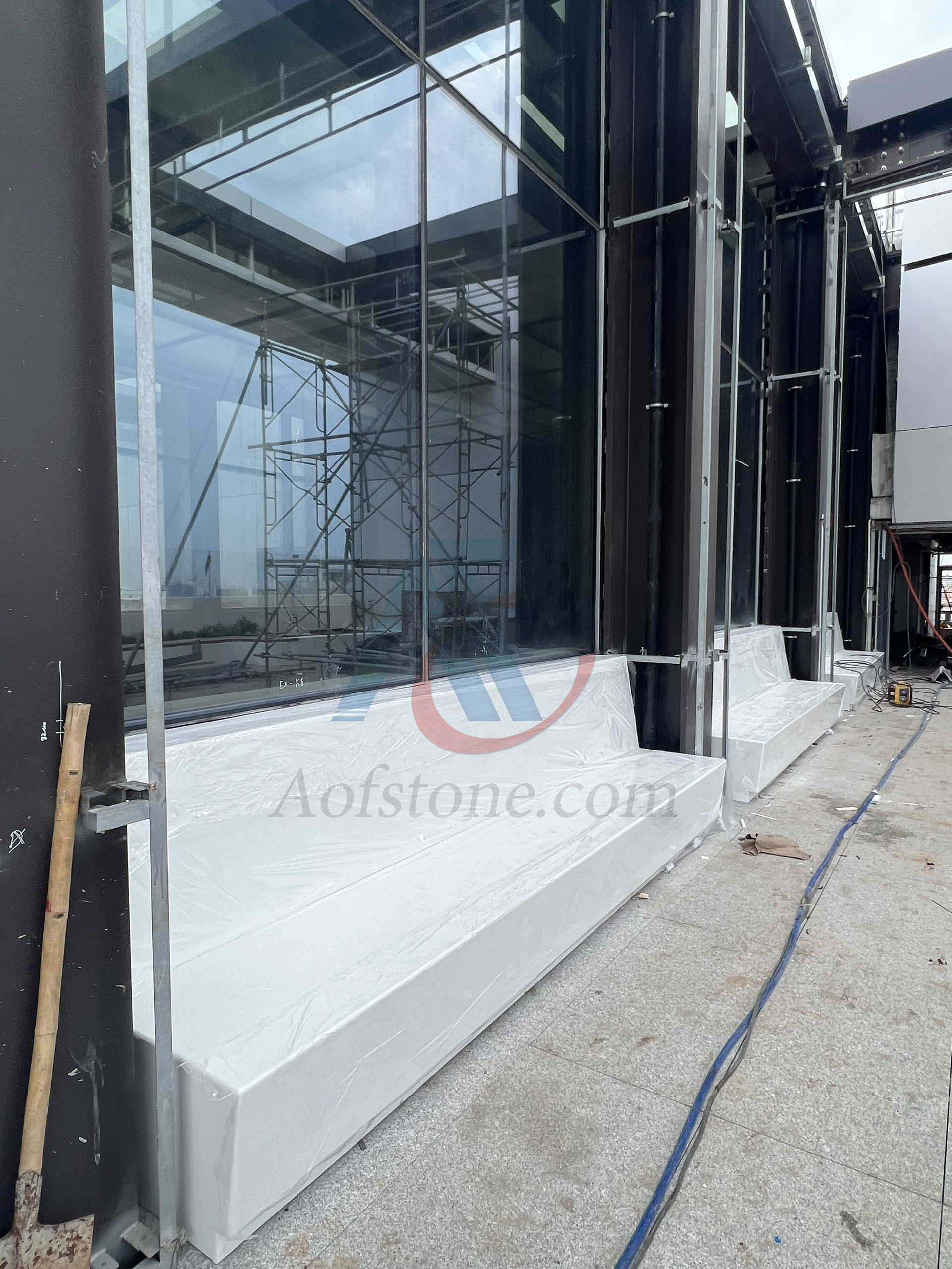 Nội thất AOF lắp đặt ghế ngồi và kệ bông bằng đá Solid Surface cho Ngân hàng Techcombank