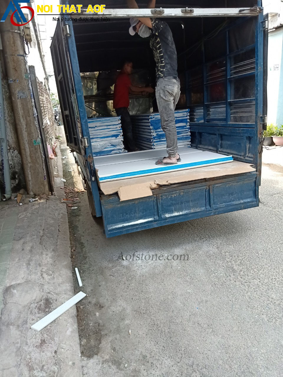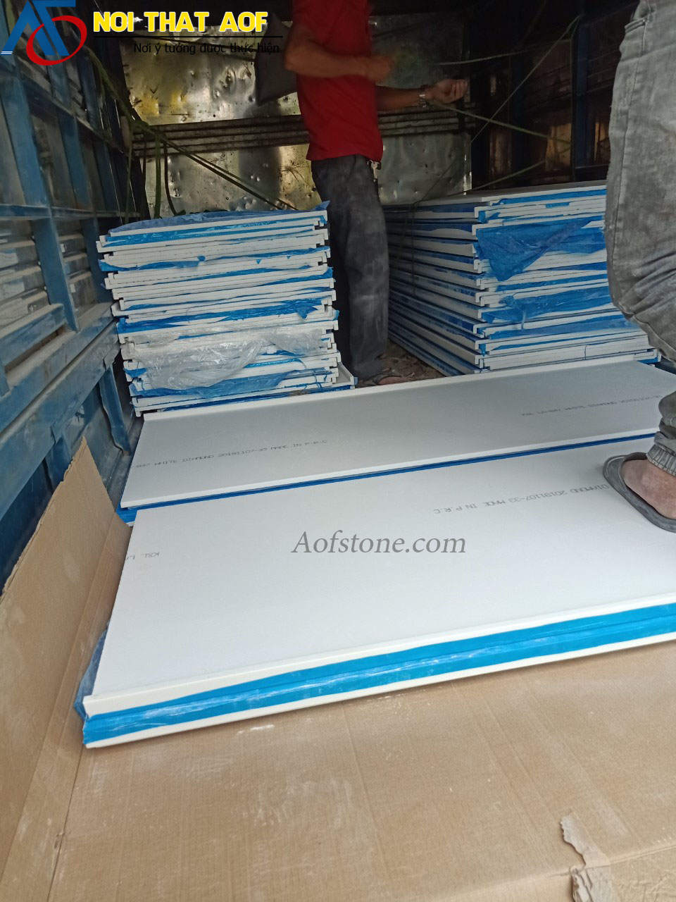 Đá Solid Surface được nhập khẩu nguyên tấm từ nhà máy, sau khi nhập đá về xưởng với đội ngũ thợ chuyên nghiệp của Nội Thất AOF sẽ gia công đá theo yêu cầu về kích thước và kiểu dáng của khách hàng và chủ đầu tư.
