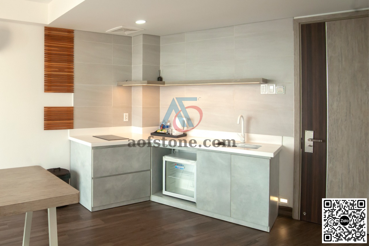 Thi công quầy lễ tân, mặt lavabo và mặt bếp cho dự án thiền tự Ohana Village Quy Nhơn