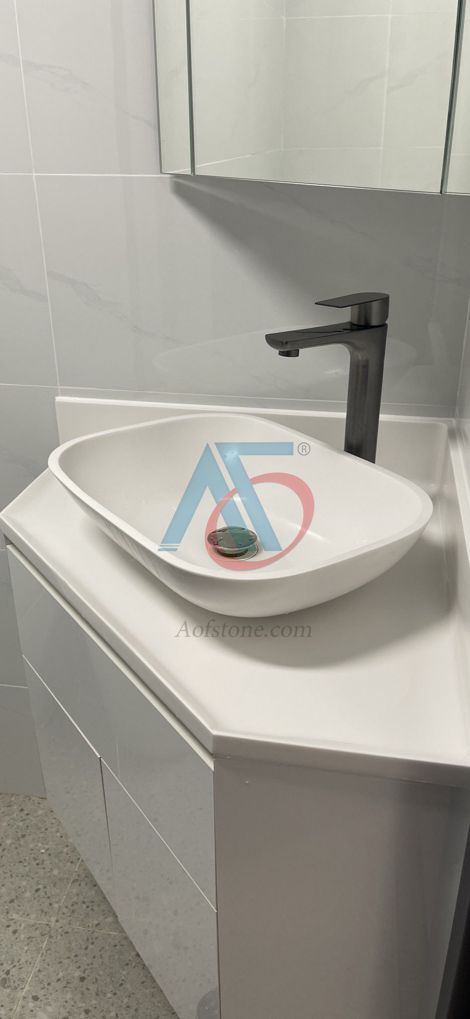 Lavabo dương bàn đá Solid Surface phù hợp với nhiều không gian khác nhau, từ phòng tắm hiện đại, sang trọng đến phòng tắm cổ điển, vintage. Loại lavabo này đặc biệt phù hợp với những phòng tắm có diện tích rộng rãi.