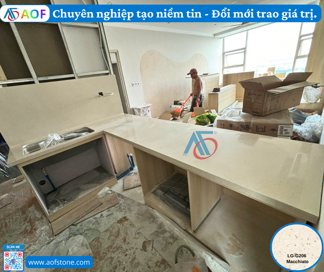 2. Tối ưu hóa không gian và khám phá Bắc Giang hoàn thành bàn đảo solid surface liền khối cùng mặt bếp.
