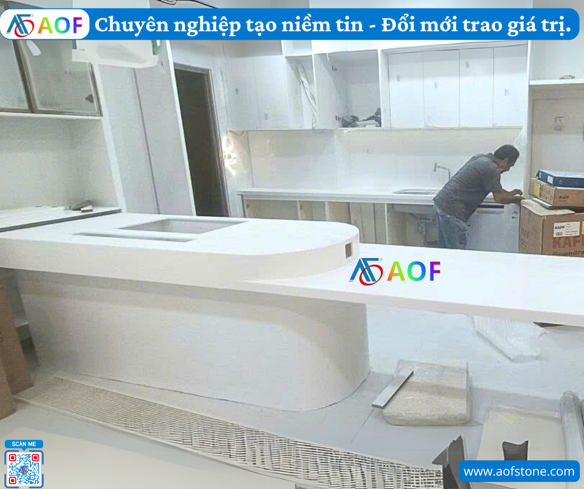 - Thiết kế phức tạp: Các yêu cầu như uốn cong, bo góc, tạo hình 3D, khắc CNC, tích hợp chậu rửa đúc liền (seamless sink), hay các chi tiết trang trí đặc biệt sẽ đòi hỏi kỹ thuật cao hơn, thời gian thi công lâu hơn và vật tư phụ trợ nhiều hơn, dẫn đến báo giá thi công đá solid surface trọn gói Hà Nội tăng lên đáng kể.