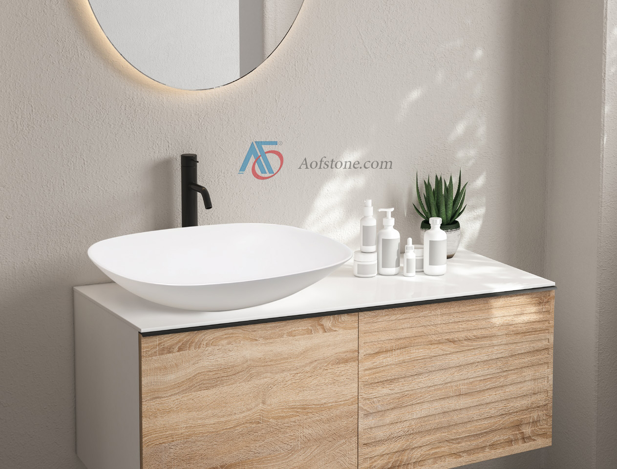 Chậu rửa (lavabo) đá solid surface mang đến tính đồng bộ và sự thuận lợi trong việc ứng dụng đá Solid Surface vào các thiết kế nhà bếp và phòng tắm. Nội Thất AOF đã nghiên cứu và phát triển dòng sản phẩm chậu rửa đúc nguyên khối từ vật liệu đá Solid Surface.