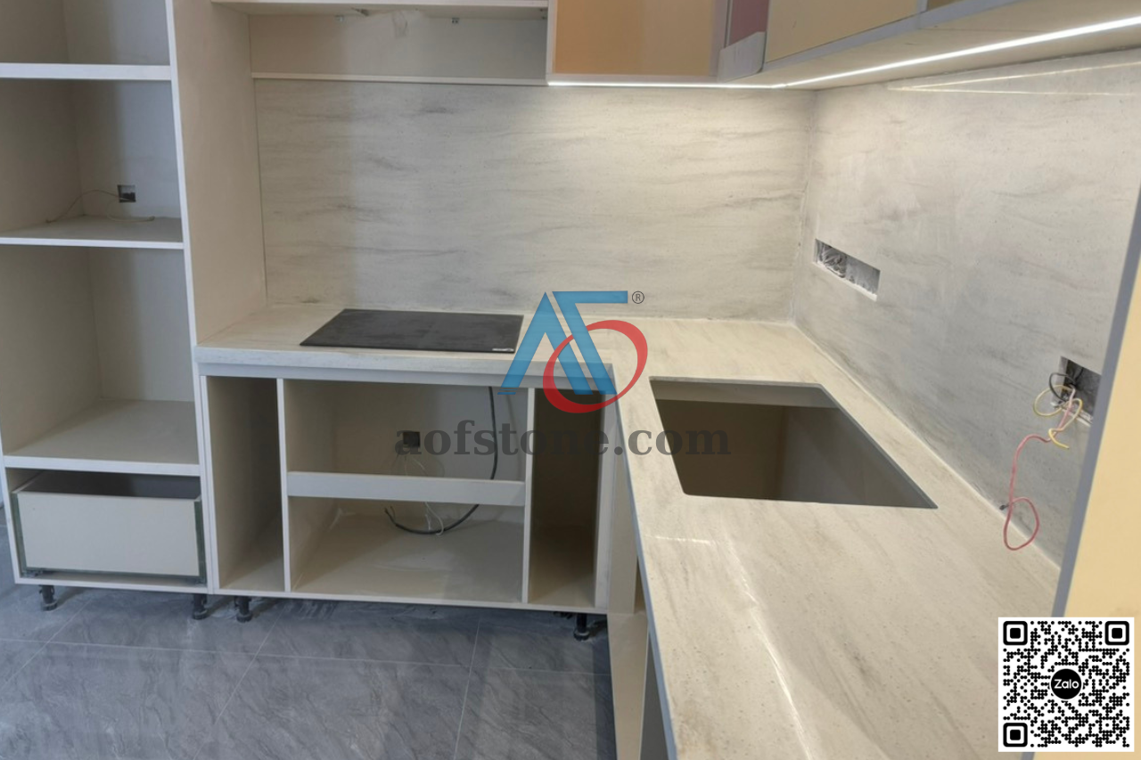 - Mẫu đá Solid Surface màu vân mây: Màu vân mây mang đến vẻ đẹp ấm cúng, gần gũi, phù hợp với những không gian bếp truyền thống. Đá Solid Surface màu vân mây ốp bếp sẽ giúp không gian bếp thêm ấm áp, thân thiện.