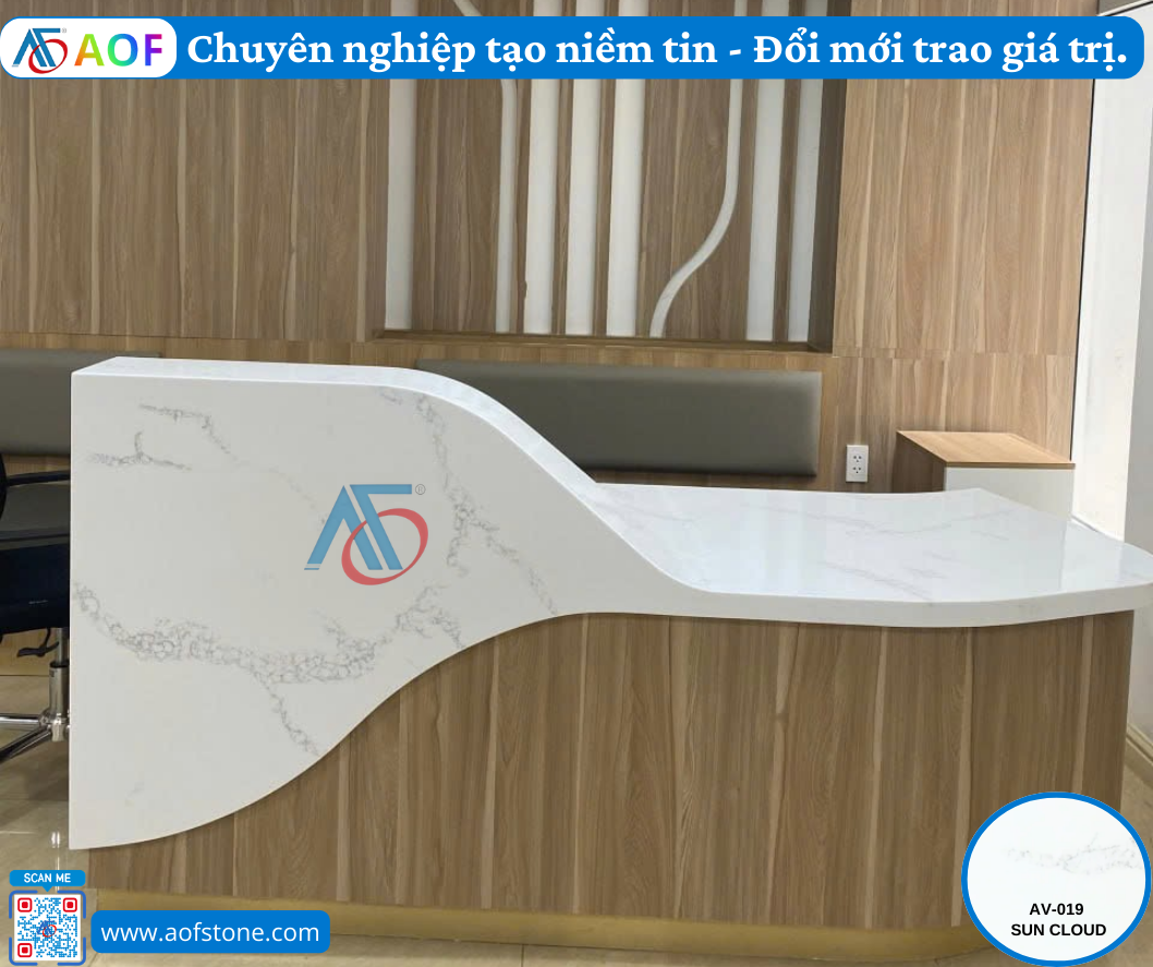 - Thẩm mỹ đa dạng: Solid Surface có thể được gia công thành nhiều hình dáng, màu sắc và hoa văn khác nhau, từ đó tăng tính sáng tạo trong thiết kế quầy lễ tân.