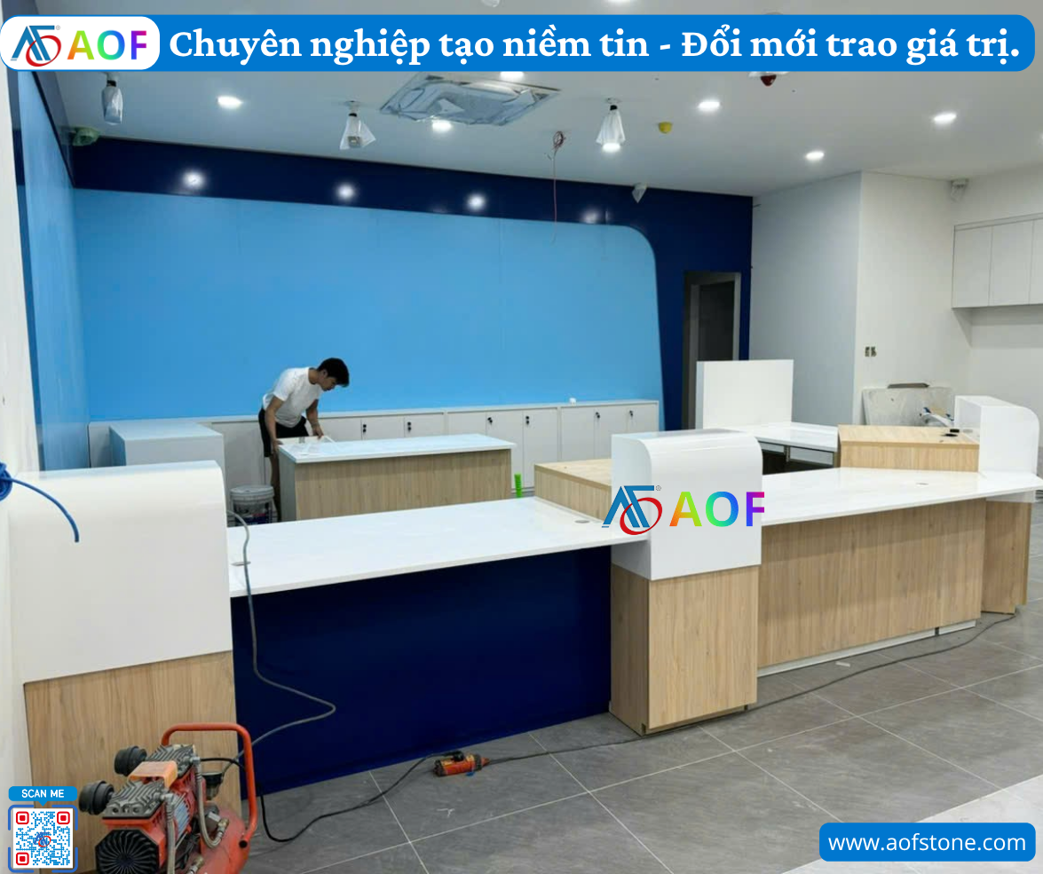 Khi chọn đá Solid Surface, bạn không chỉ đang lựa chọn một vật liệu, mà còn là một giải pháp thiết kế. Các đơn vị thi công như AOF cam kết cung cấp nguyên liệu chính hãng, đảm bảo chất lượng và độ bền sản phẩm. Đội ngũ thiết kế giàu kinh nghiệm sẽ giúp tối ưu hóa không gian quầy giao dịch, tạo nên một sản phẩm vừa đẹp mắt vừa tiện dụng.