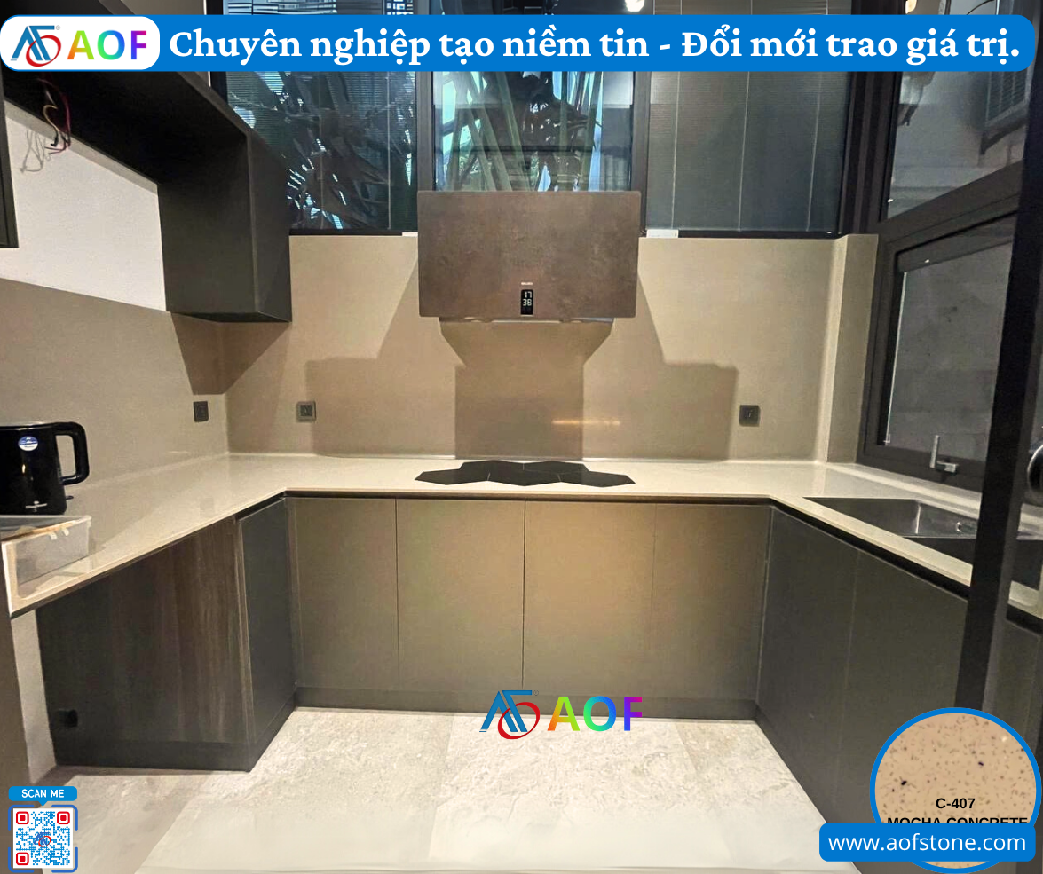 Tìm đơn vị thi công đá bếp Solid Surface liền vách uy tín tại Tây Ninh? Bài viết phân tích lợi ích, hướng dẫn chọn thợ chuyên nghiệp & giới thiệu AOF.