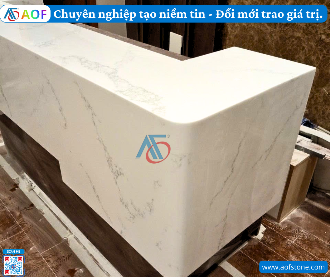 Ngoài việc phục vụ công năng, quầy lễ tân solid surface ghép nối liền mạch còn là một phần của bộ nhận diện thương hiệu. Khi khách hàng bước vào, sự hiện diện của một quầy lễ tân hiện đại, sang trọng sẽ tạo cảm giác đáng tin cậy, chuyên nghiệp và chu đáo. Hình ảnh của công ty được nâng cao không chỉ từ dịch vụ mà còn từ không gian mà doanh nghiệp tạo ra.